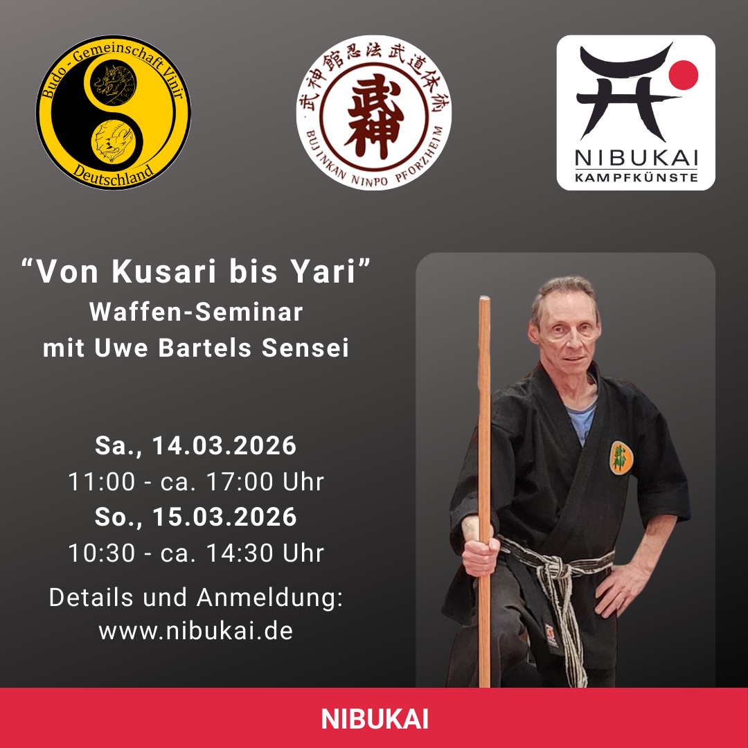 Ein spannendes Seminar mit Uwe Bartels Sensei erwartet Euch! An 2 Tagen haben Einsteiger und Fortgeschrittene die Möglichkeit, Erfahrungen und Wissen im Bereich der Bujinkan- Waffen zu sammeln. Anmeldung bitte unter mail(at)nibukai.de oder direkt im Dojo.